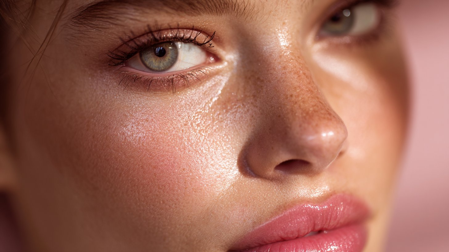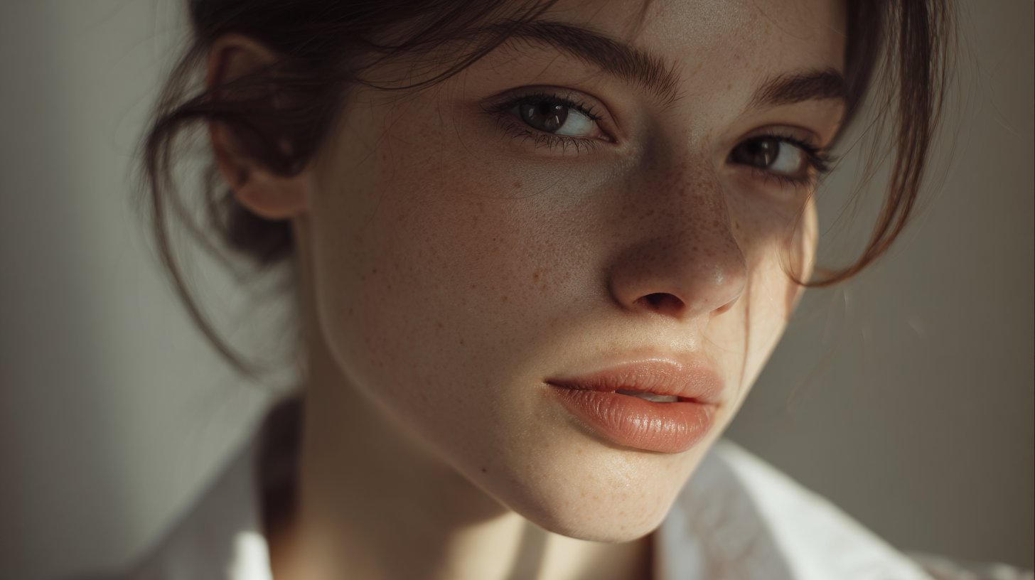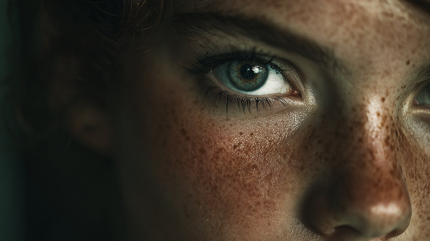 Macro beauty portrait, soft diffused light, pristine skin detail, glossy eyes, delicate colour grading, high-end beauty photography style.
