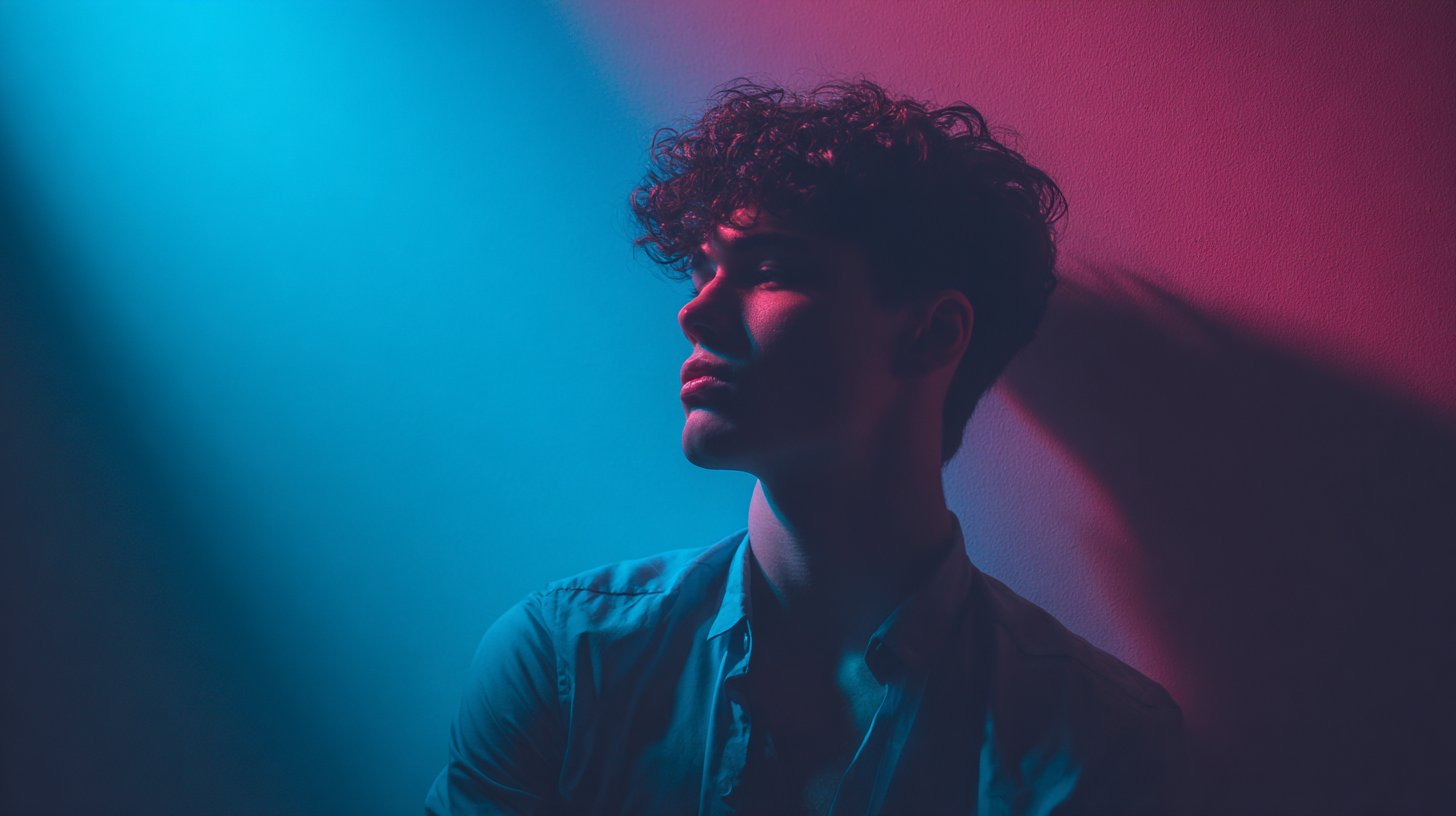 Studio portrait with blue–pink coloured gel lighting, bold atmosphere, sharp edges, moody aesthetic, crisp focus, expressive pose.