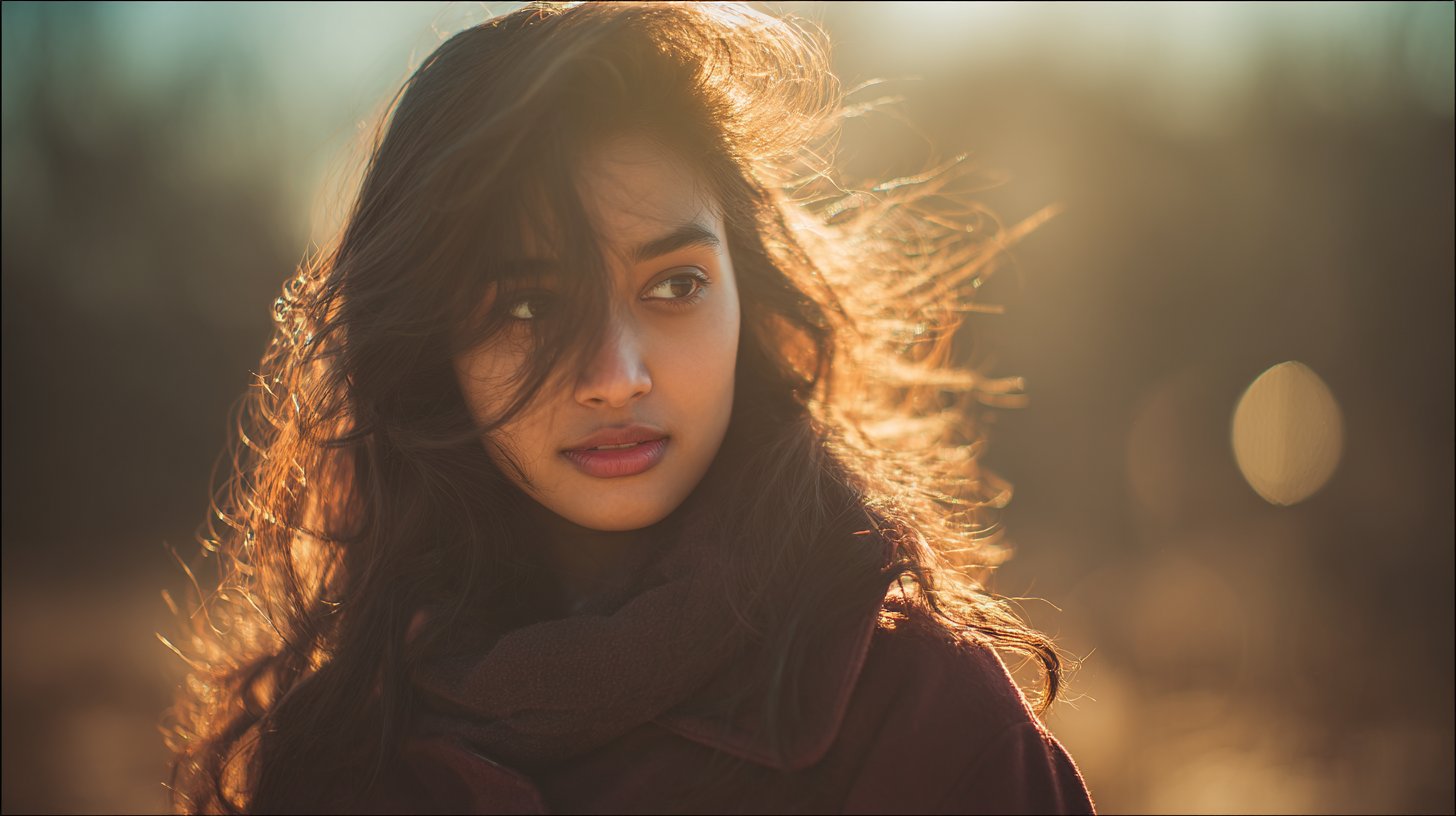 Outdoor portrait with cinematic sunlight, warm tones, light breeze, realistic shadows, subtle bokeh, soft natural glow.