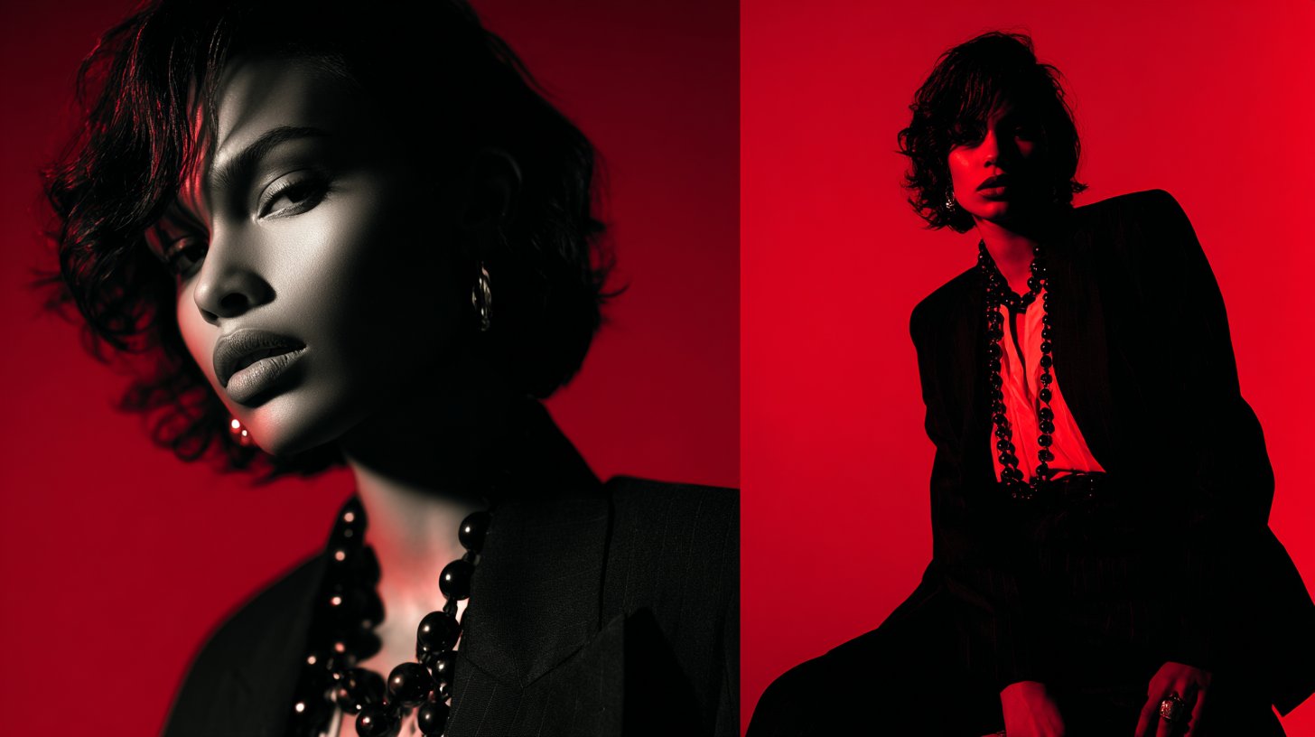 Editorial fashion portrait, bold lighting contrast, refined styling, magazine aesthetic, sharp contours, elegant pose, studio environment.