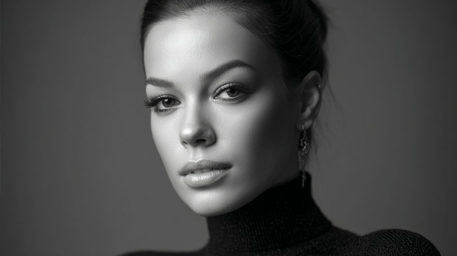 Black-and-white studio portrait, high contrast, elegant lighting arrangement, timeless look, clear facial structure, crisp monochrome texture.