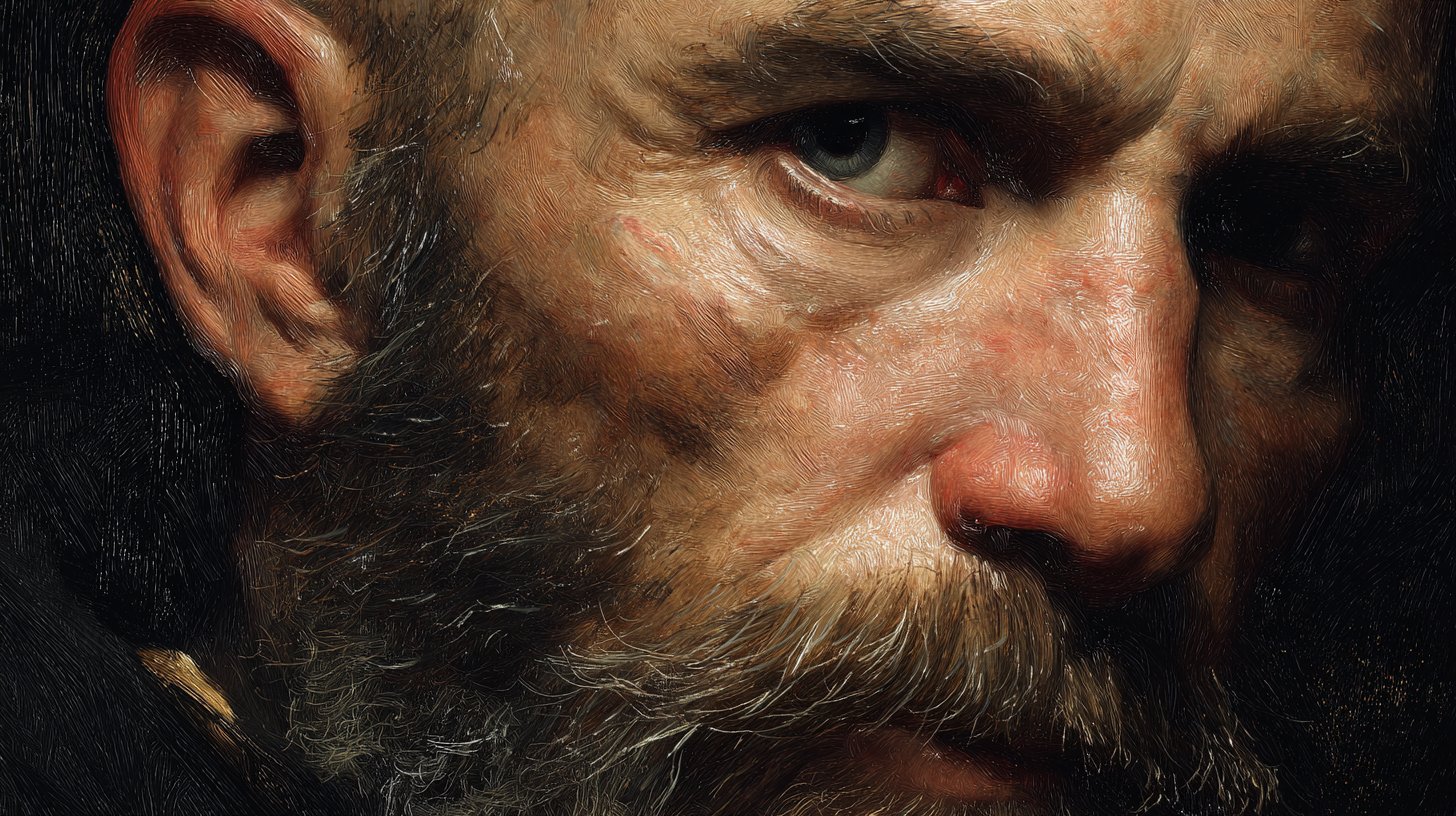 Moody character portrait, deep shadows, textured lighting, strong emotion, fine-grain detail, painterly realism, expressive eyes.