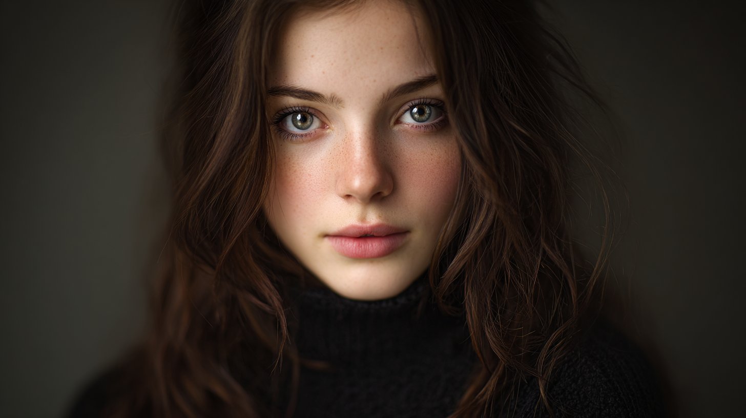 Studio portrait, soft diffused lighting, shallow depth of field, crisp details, natural skin texture, neutral grey background, professional tone.