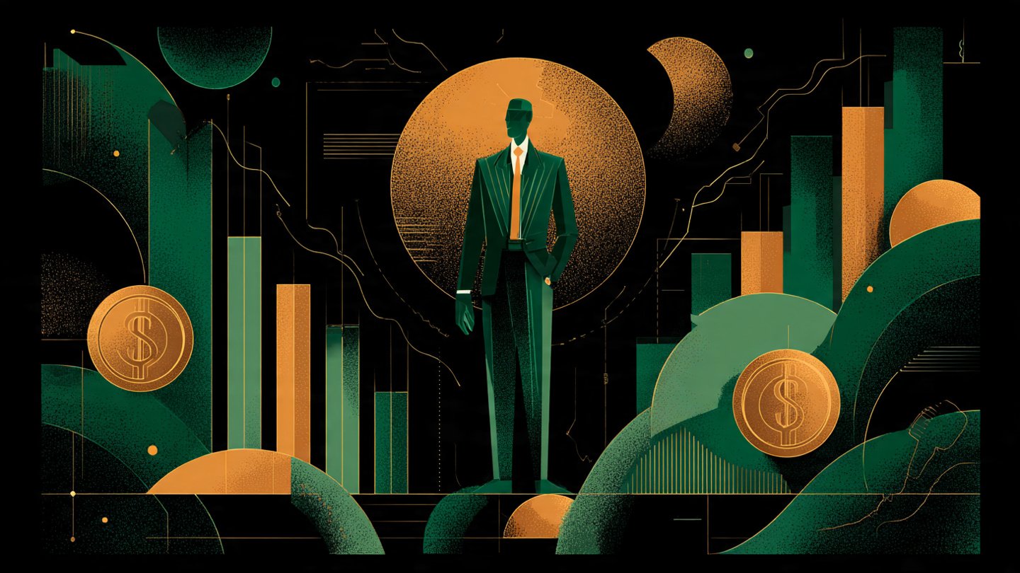 Finance thumbnail style, green and gold palette, strong central figure, crisp chart shapes, high contrast, professional clean layout.