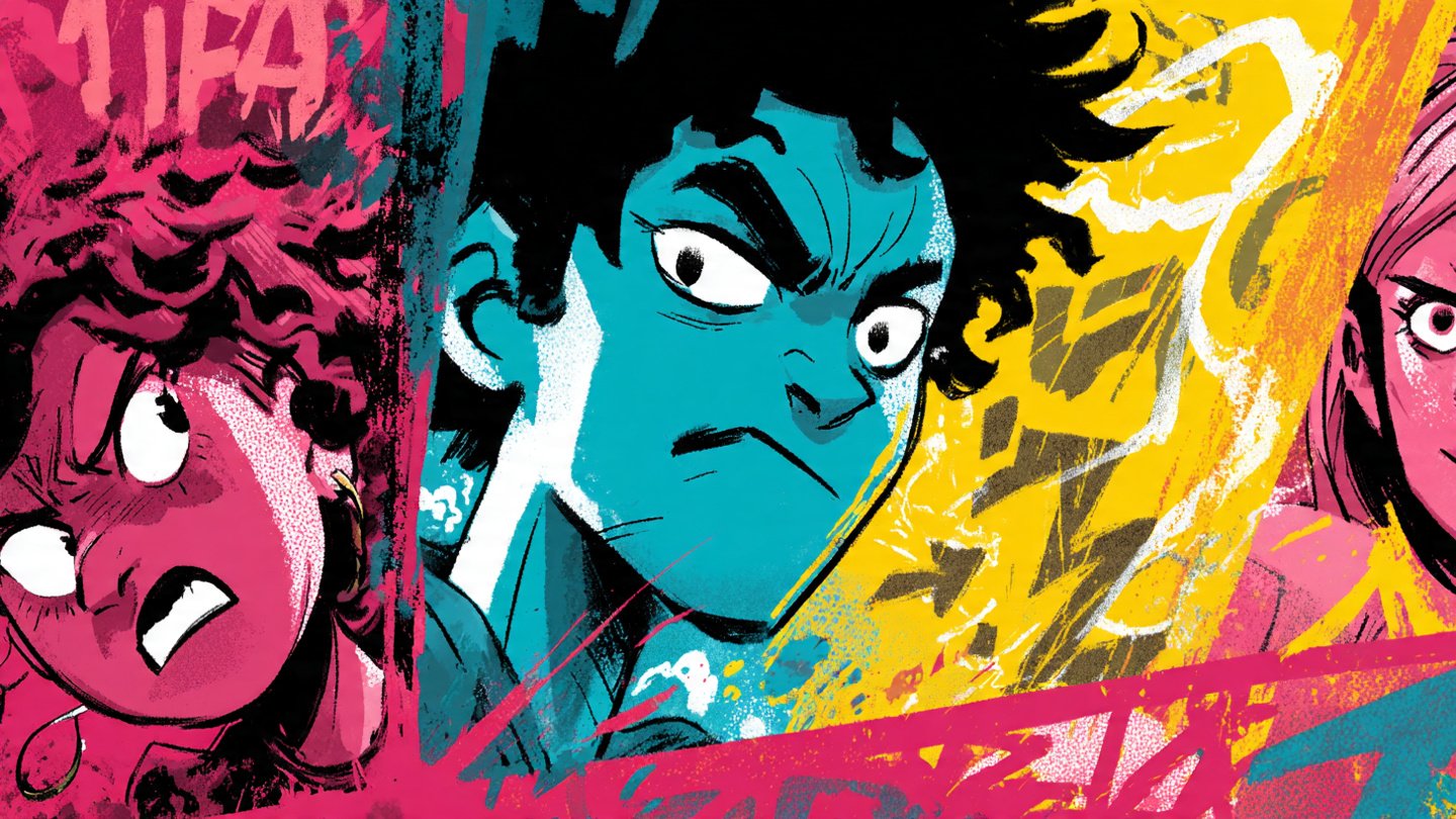 Graphic comic-style thumbnail, thick black outlines, punchy colours, energetic angles, expressive illustrated characters.