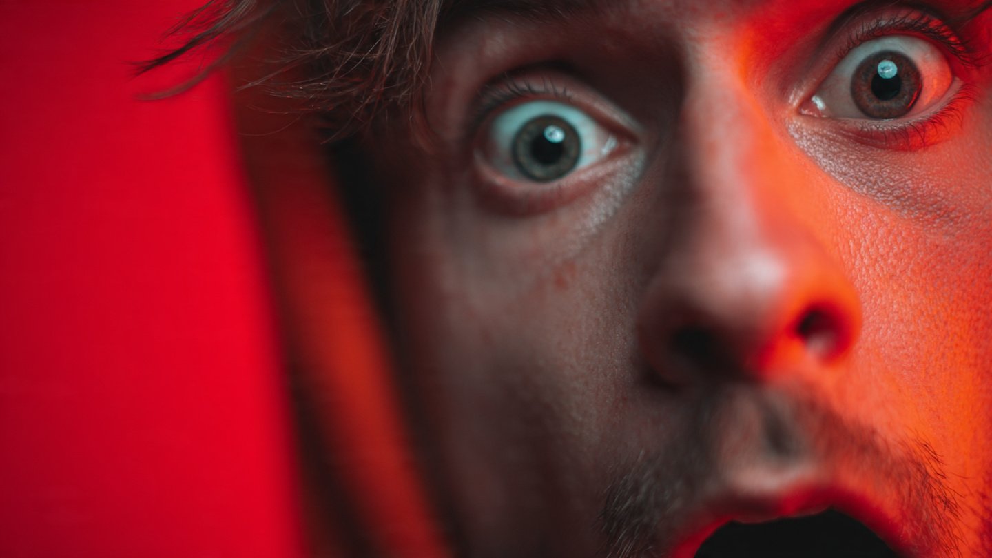 High-contrast close-up of a surprised face, sharp lighting, bold colour background, dramatic expression, clean composition for YouTube thumbnail.